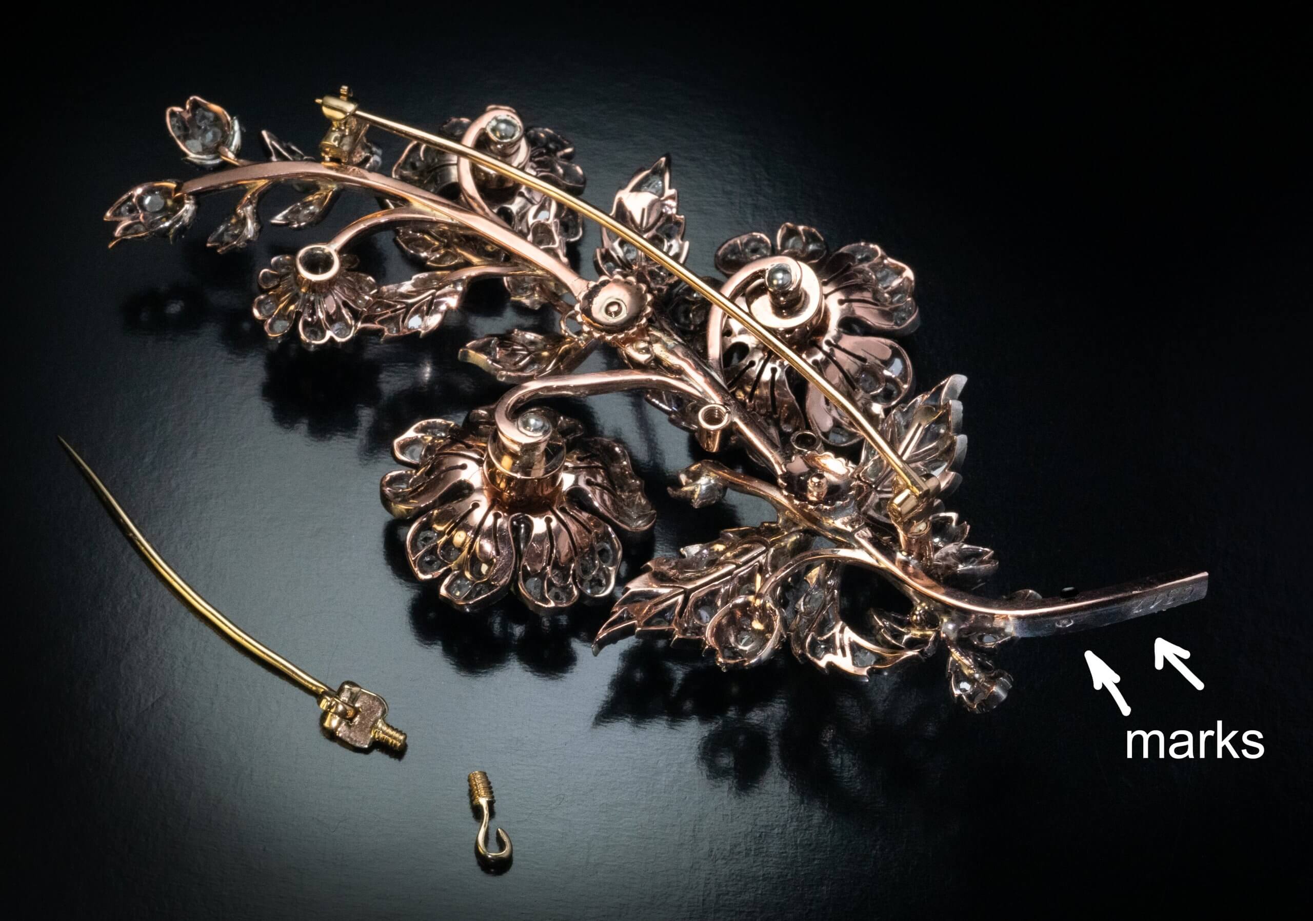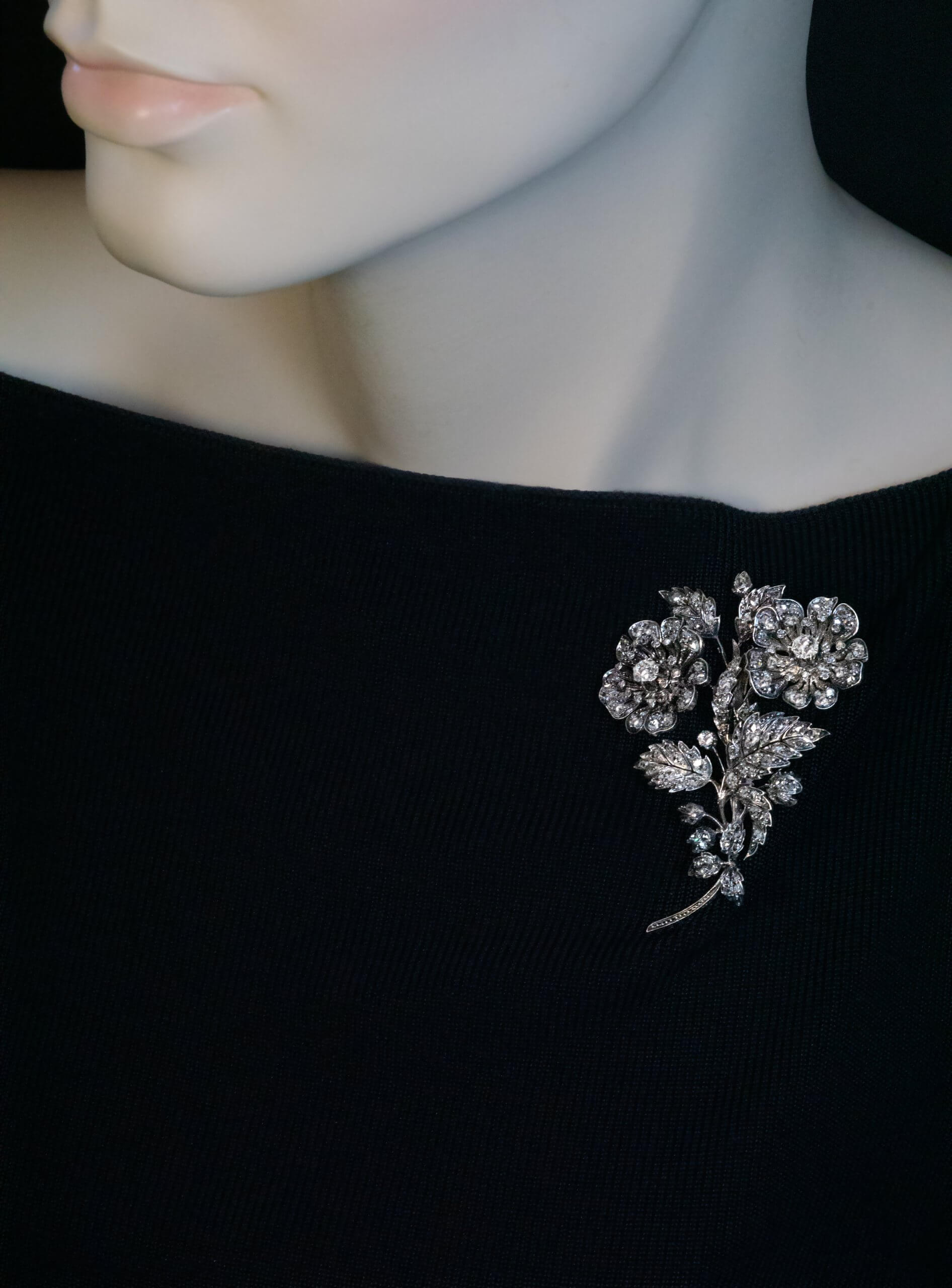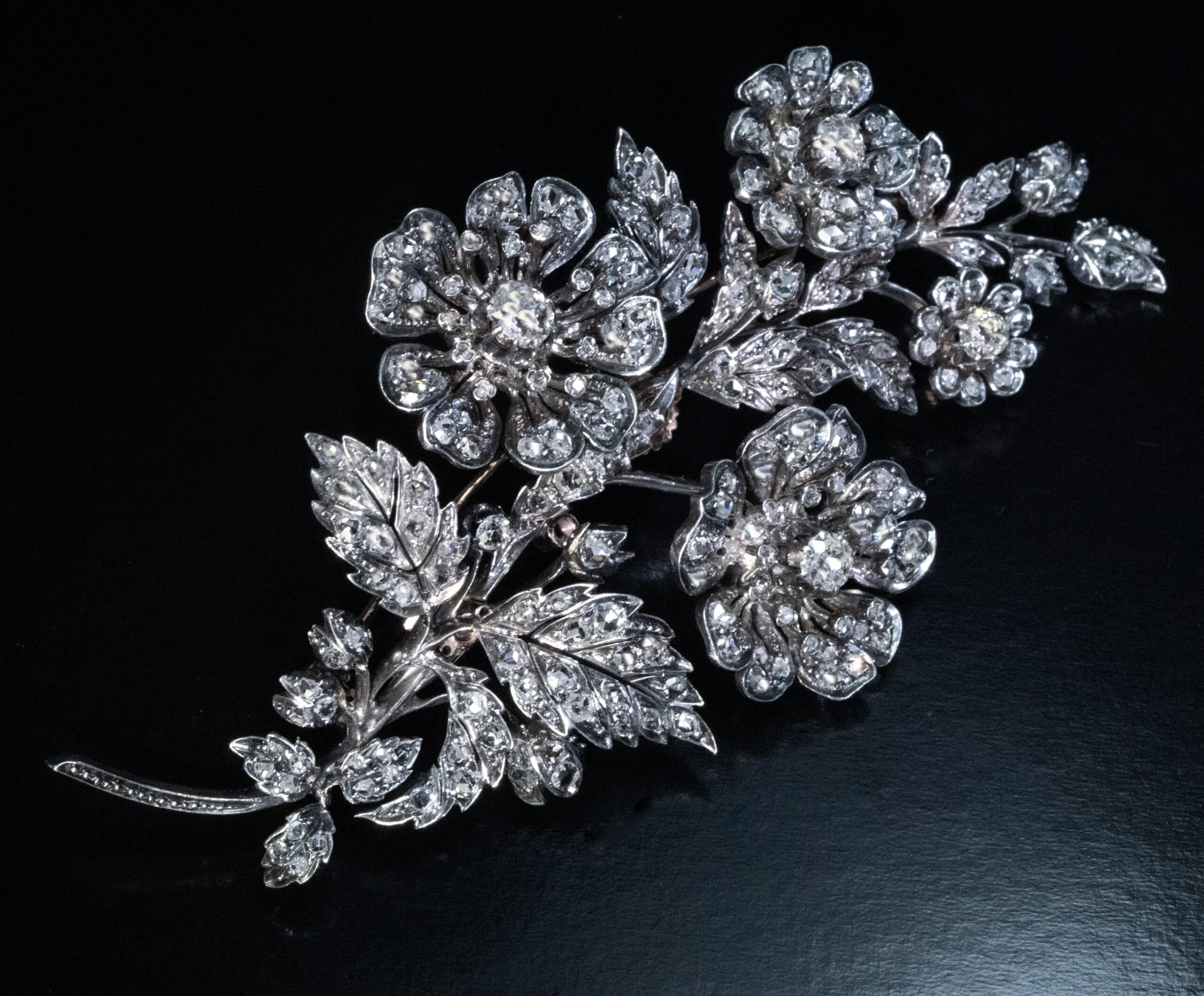 Expertly handcrafted in silver and gold, this elaborate brooch is set with numerous old mine cut and rose cut diamonds. The upper spray of flowers is detachable, allowing the piece to be worn in two different ways either as a complete, dramatic brooch or as a smaller, more refined jewel.