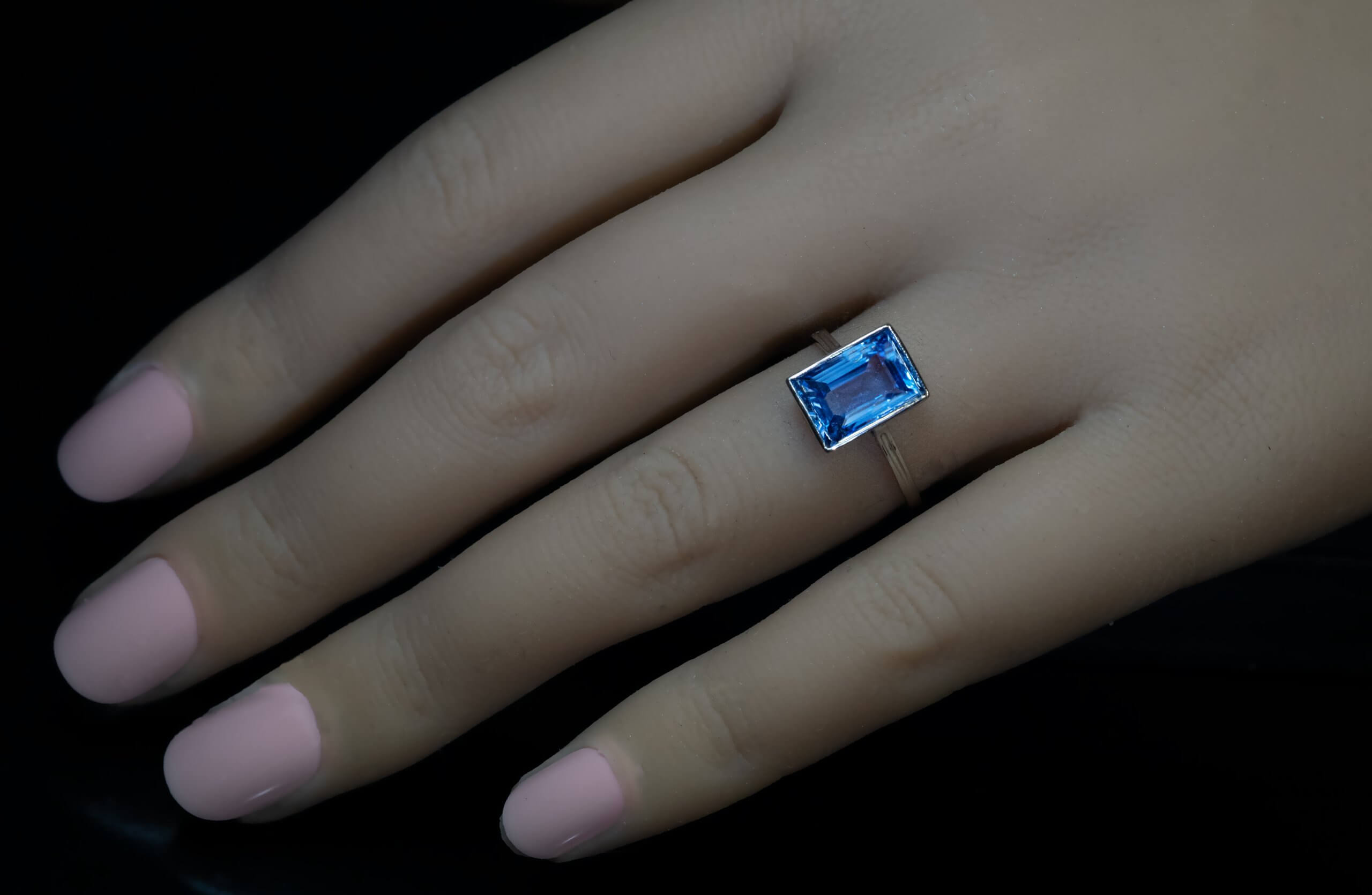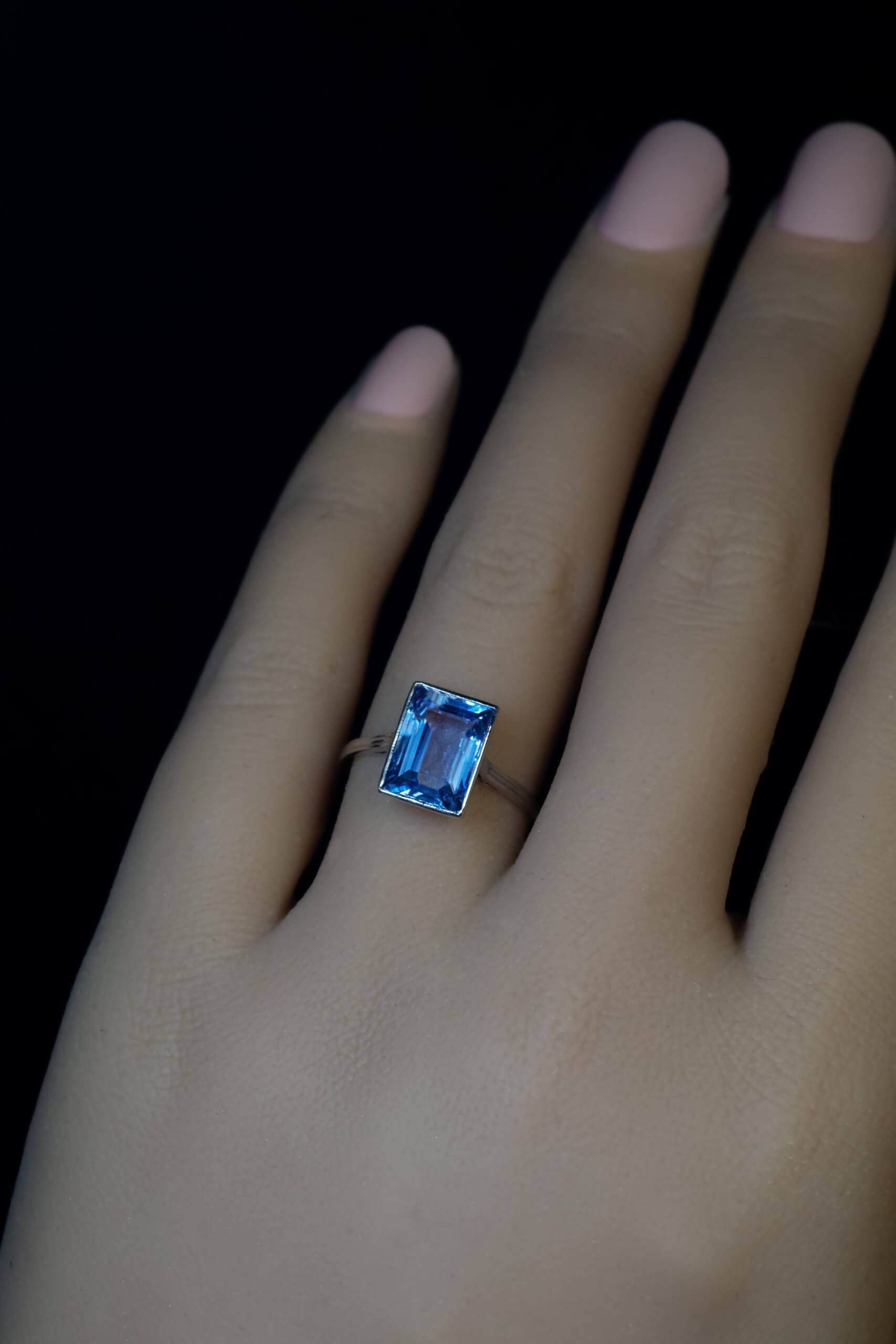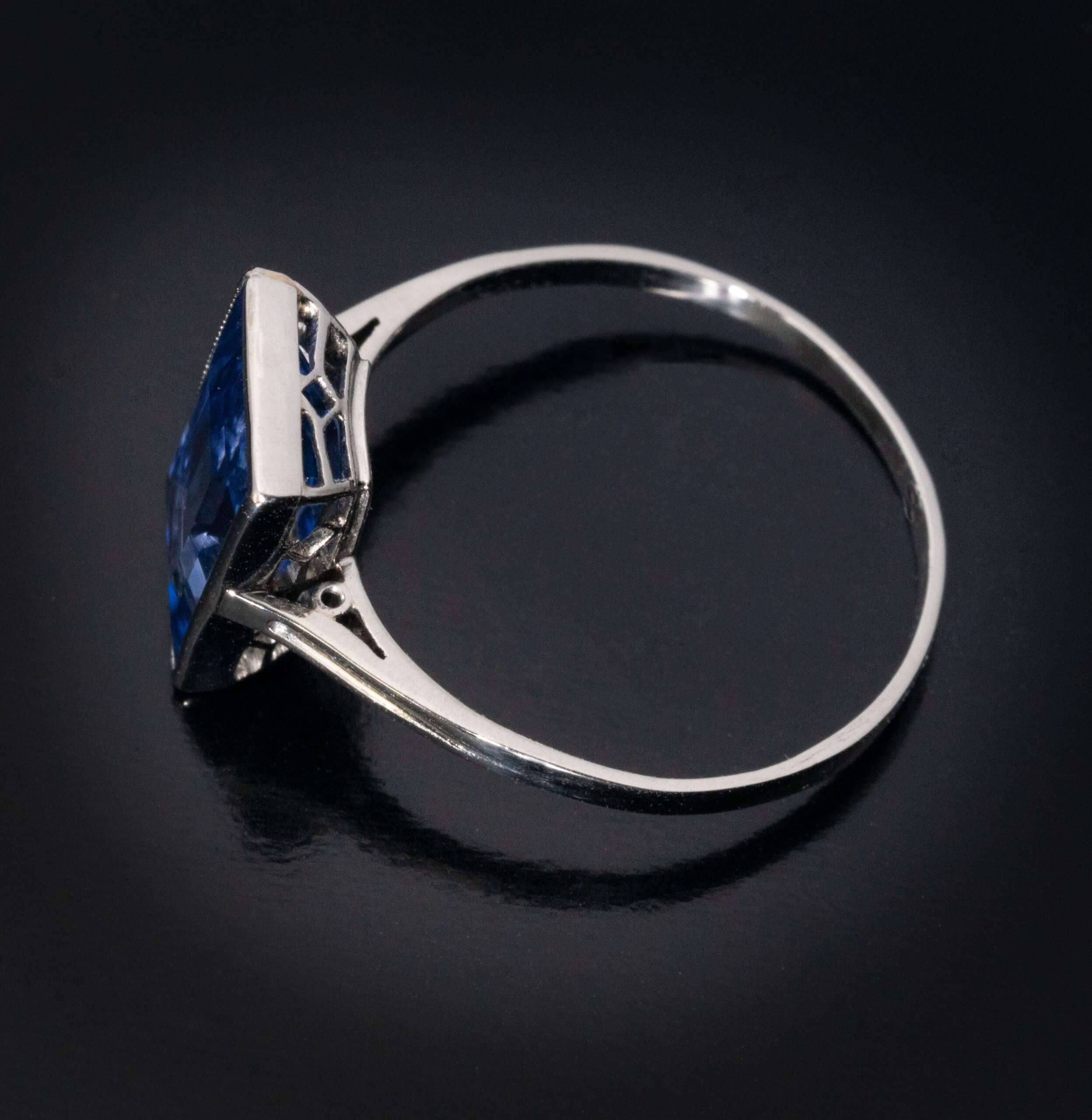 This vintage Art Deco engagement ring is crafted in platinum. It is set with a 3.44 ct rectangular step cut natural unheated sapphire from Ceylon.