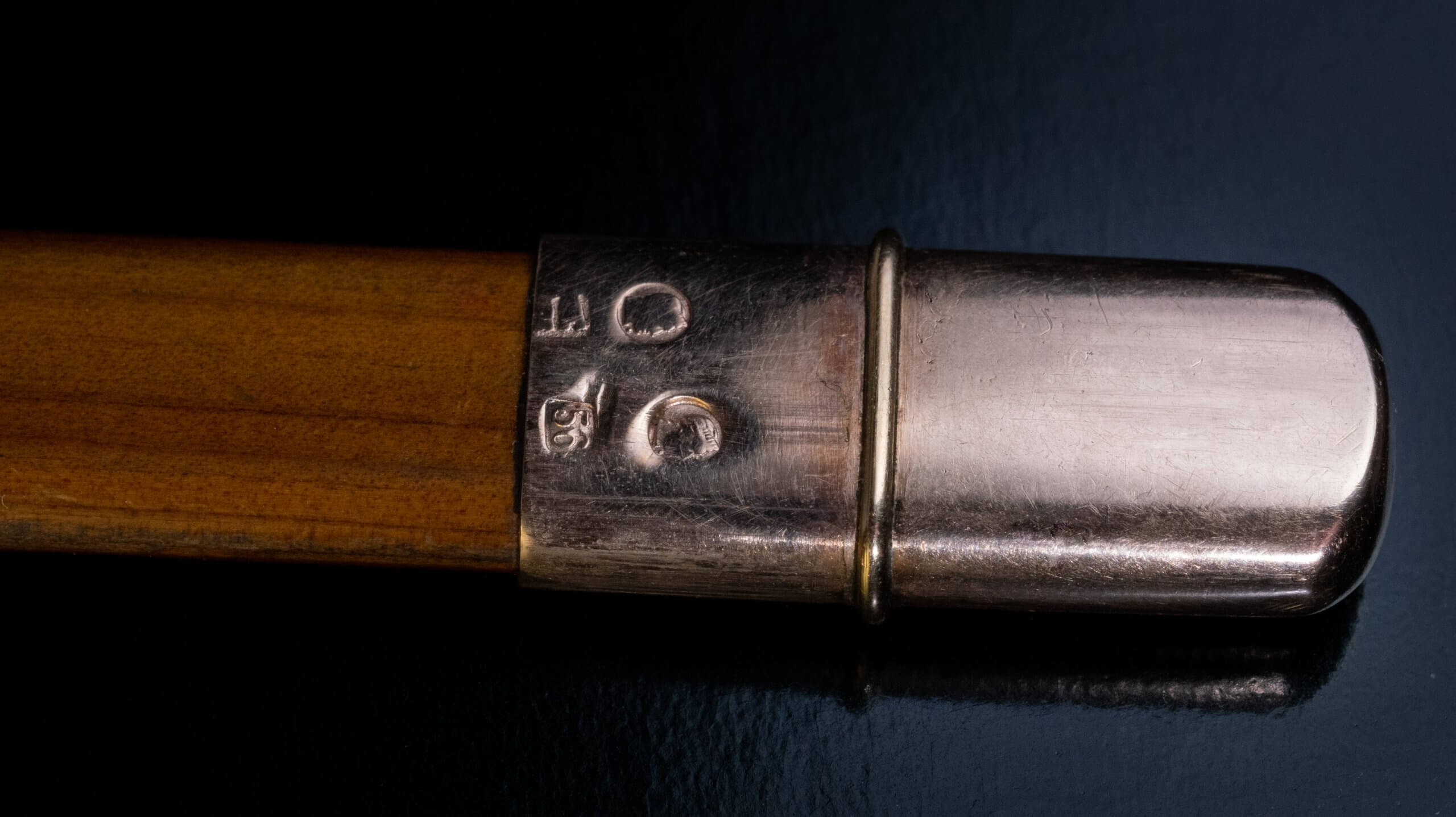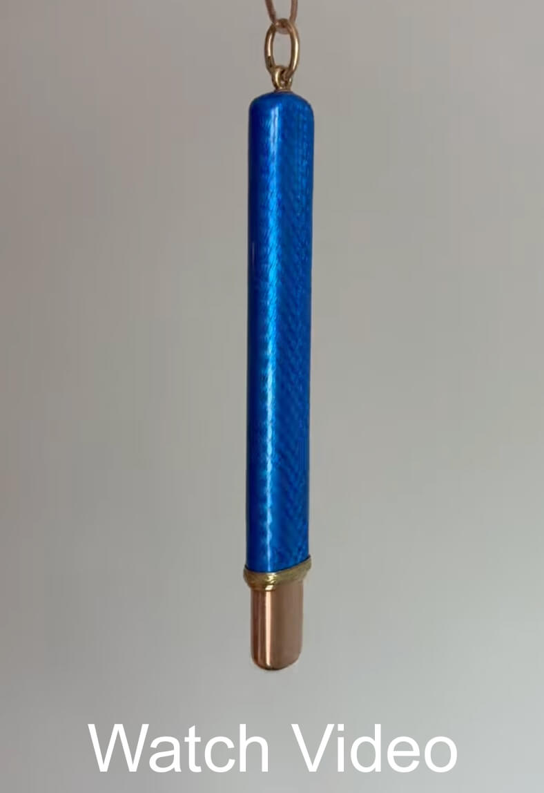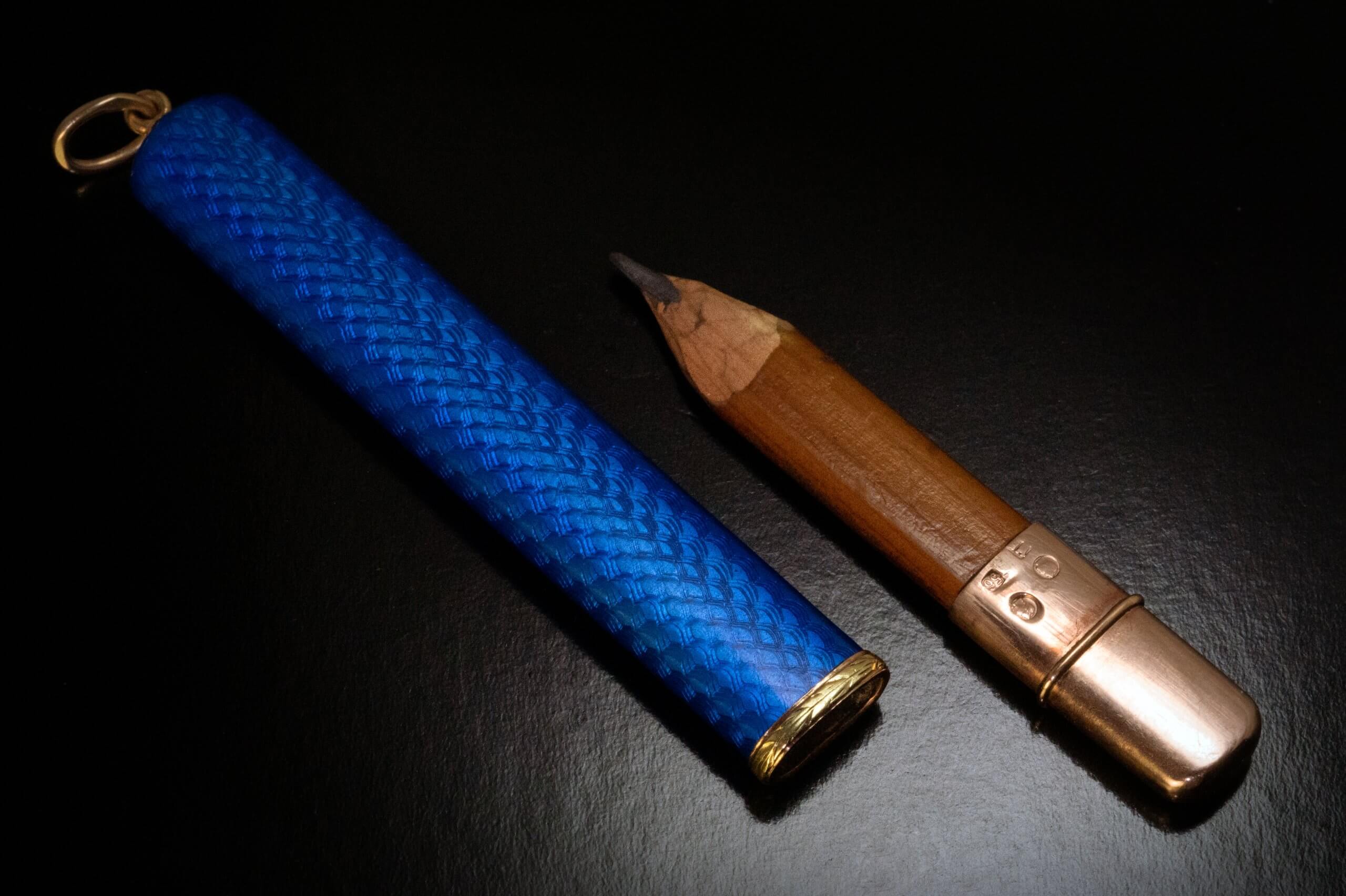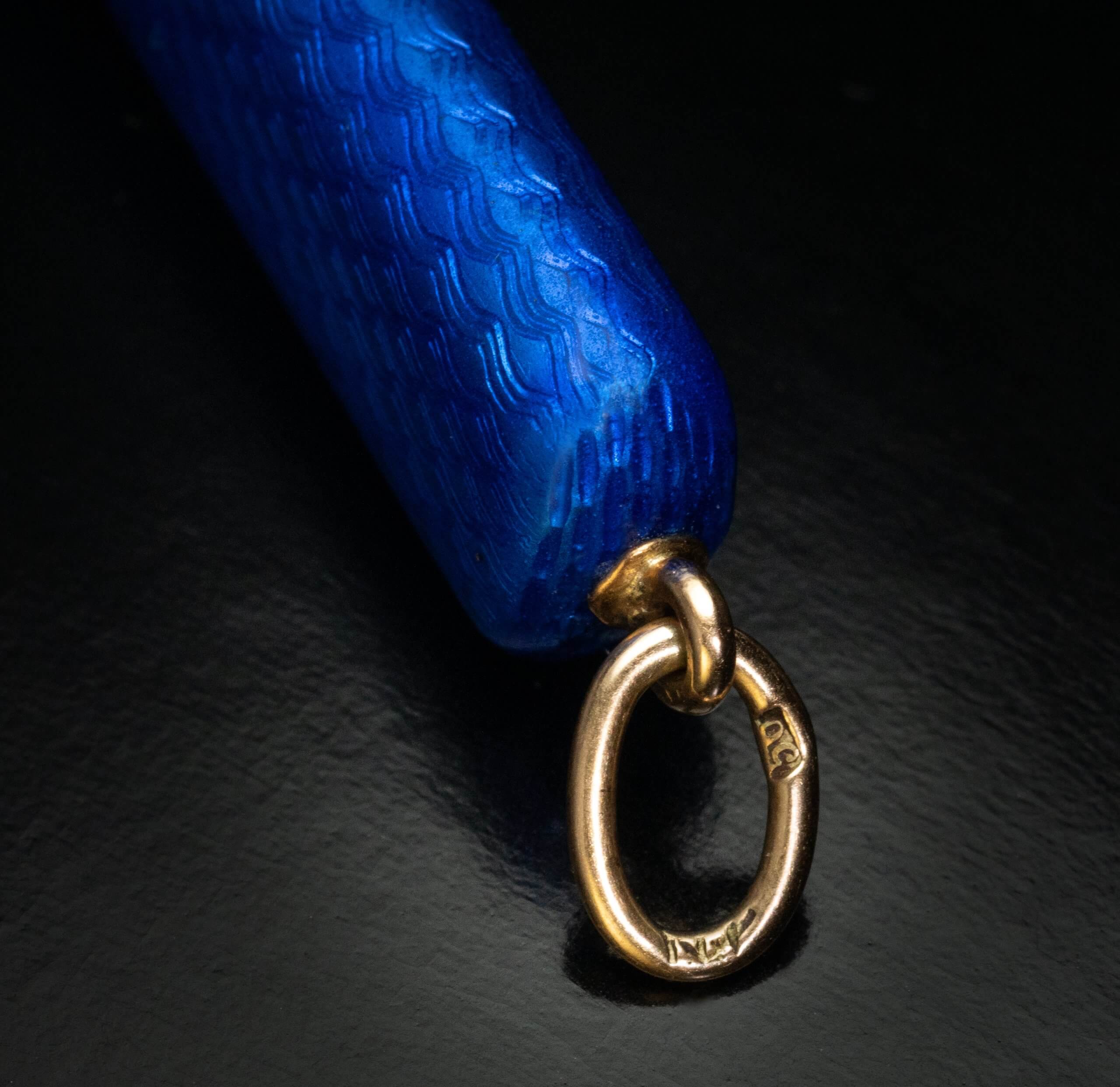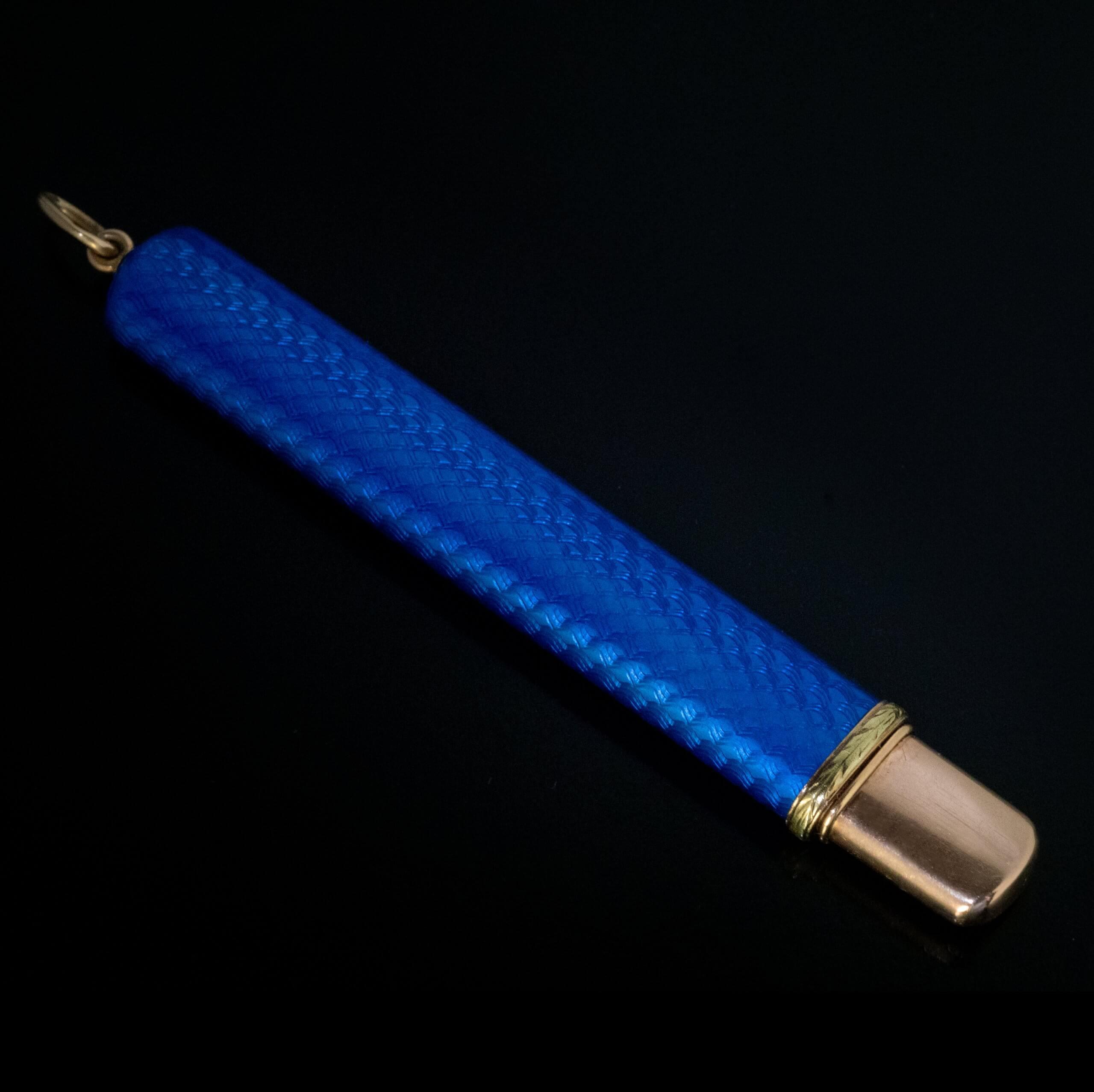 This antique Faberge two-tone 14K gold pencil holder pendant features superb royal blue guilloche enamel of exceptional quality. The oblong enamel body is accented with a chased band of green gold laurel leaves, while the rose gold cap still retains its original pencil.