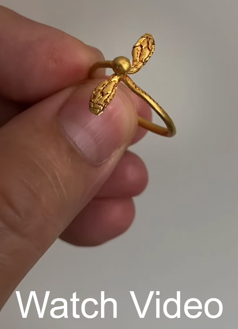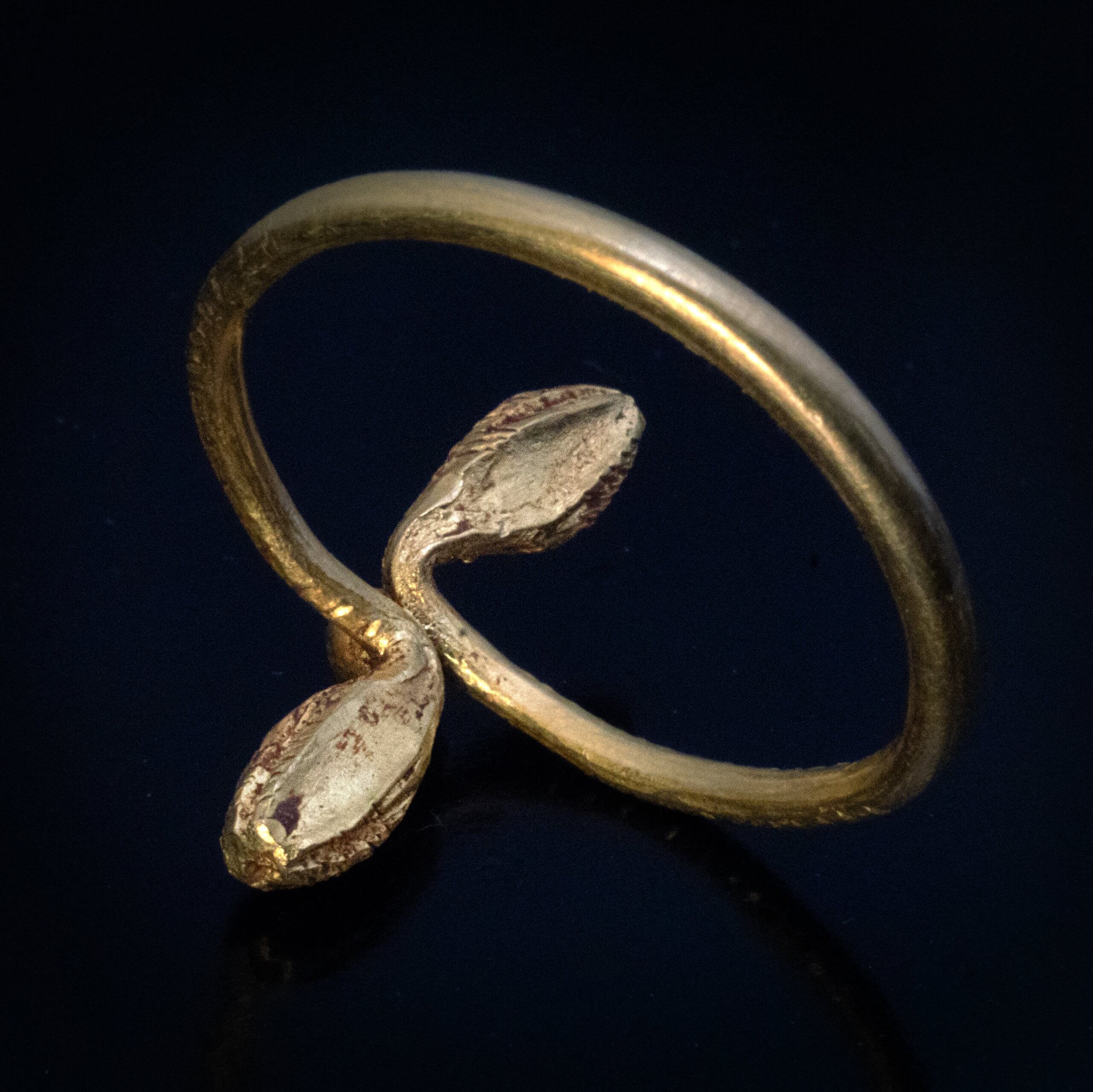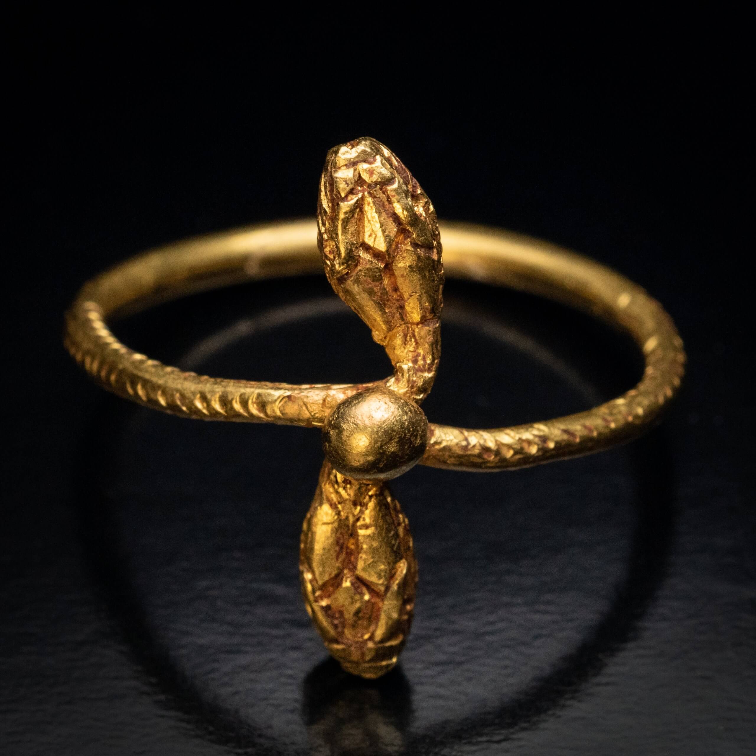 A charming ancient ring in high karat gold, formed as two coiled snakes with their heads set back-to-back and turned in opposite directions. A gold pellet is positioned between the heads. The engraved detailing on the heads and upper shank imitates the texture of snakeskin.