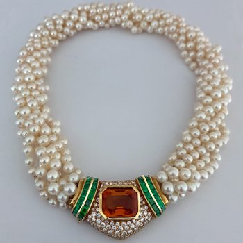 This vintage mid-20th century seven strand cultured pearl necklace is accented with a large jeweled 18K gold clasp. The clasp is centered with an emerald-cut citrine surrounded […]