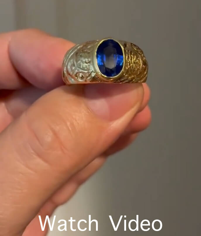 This antique one-of-a-kind 14K gold ring is designed in the Russian Modern style of the early 1900s. The ring is bezel set with a fine oval sapphire of a royal blue color. The sapphire is flanked by a pair of stylized owls, a popular subject in Art Nouveau era art. The owl symbolizes mystery or secrecy.