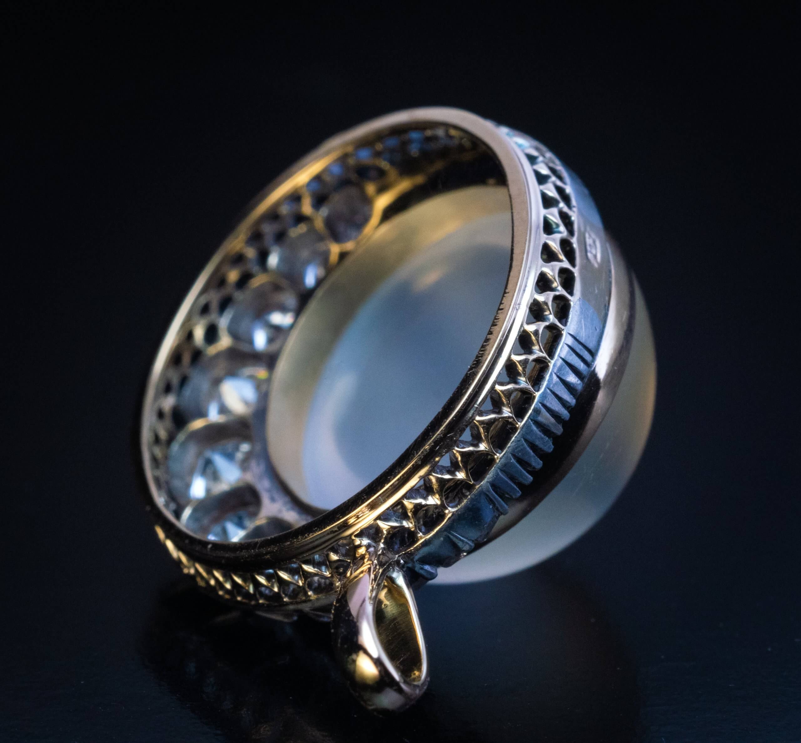 The present example is of particular note for its unusual combination of the crescent motif with a full moonstone. This piece may represent a unique or custom commission.