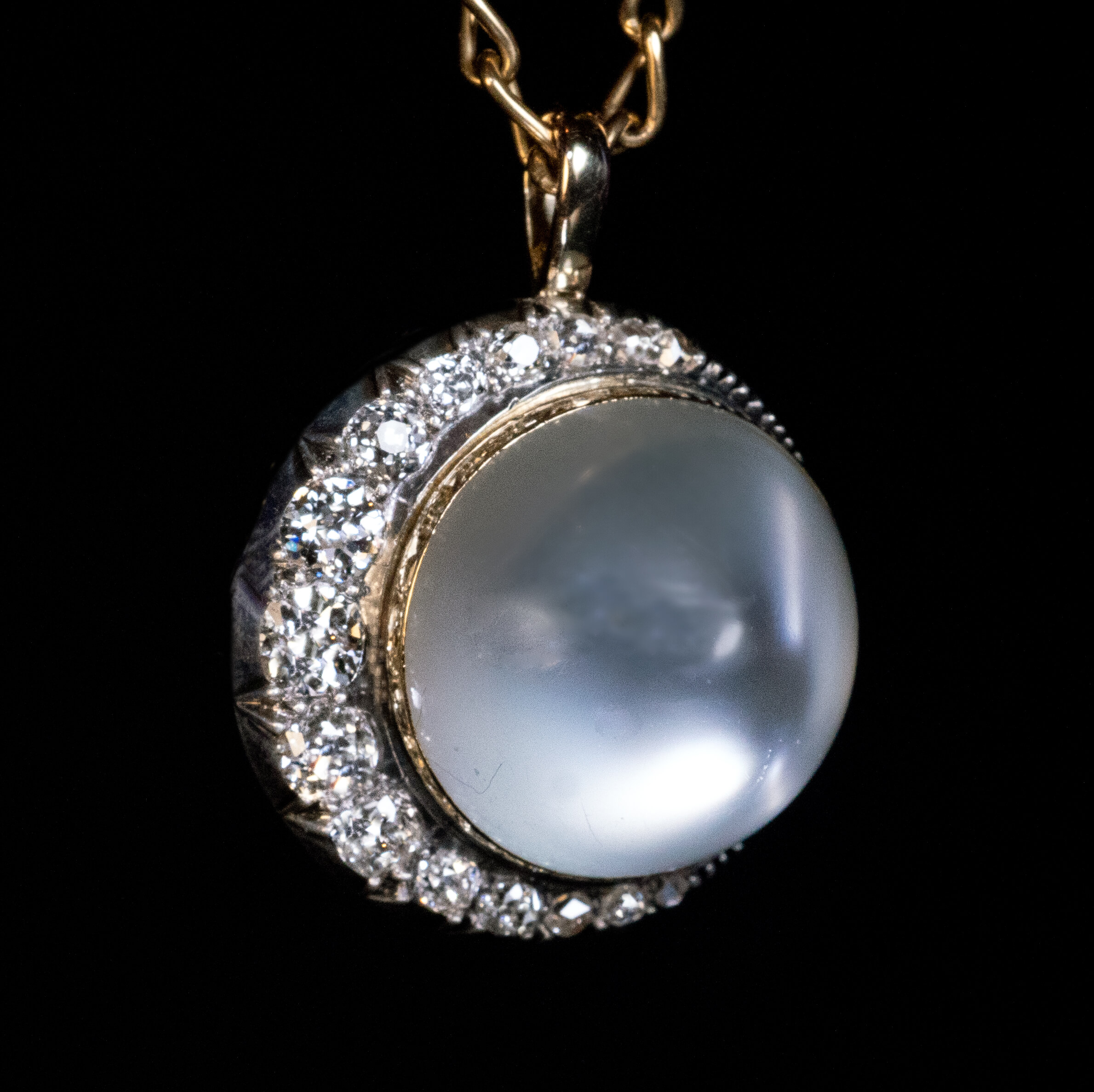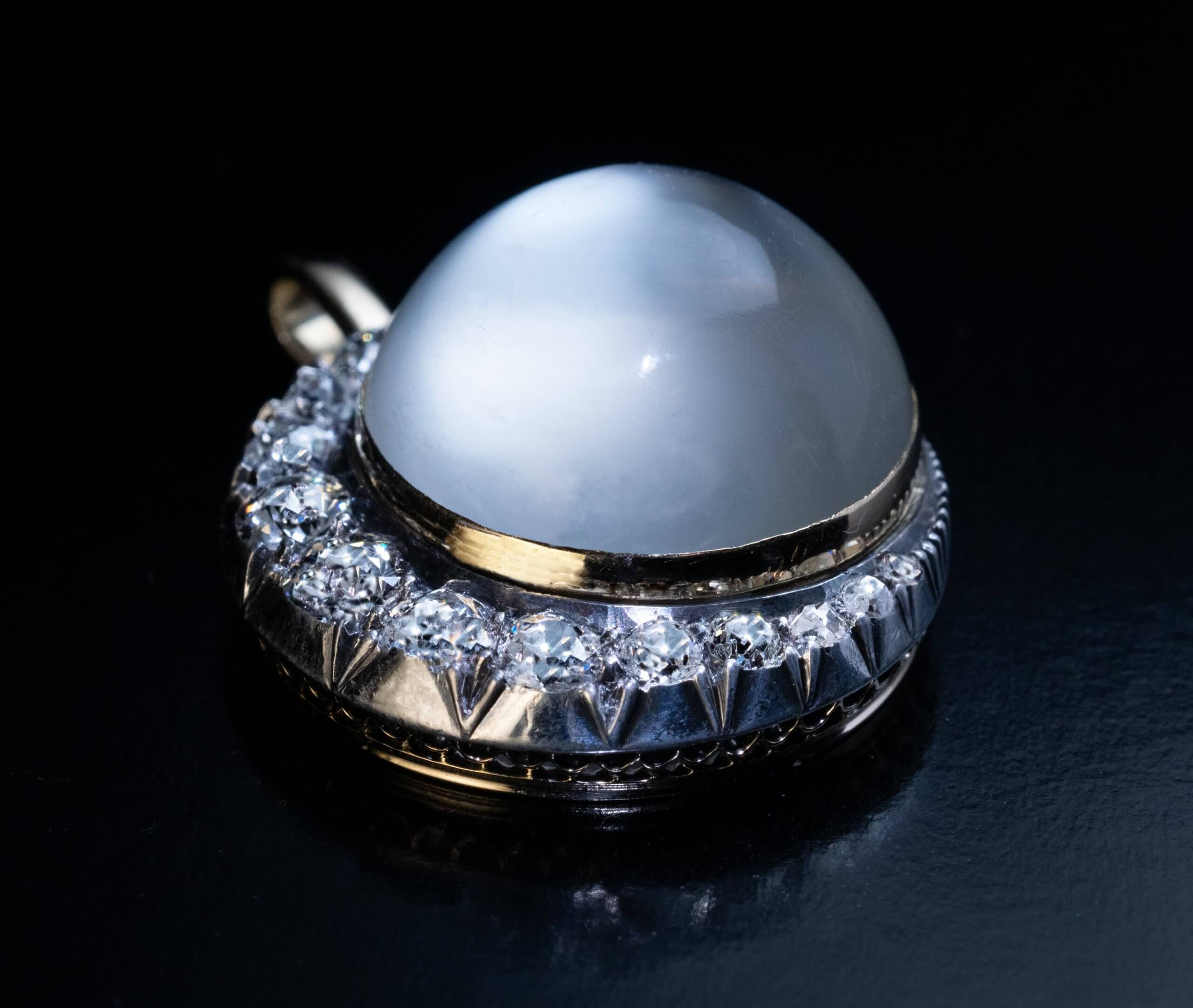 This pendant, dating to the late Victorian period, is finely crafted in 14K gold and silver. The central element is a large, high-dome cabochon moonstone, its luminous surface evocative of a full moon. A crescent set with bright white old mine cut and rose cut diamonds on the left side provides a striking visual counterbalance.