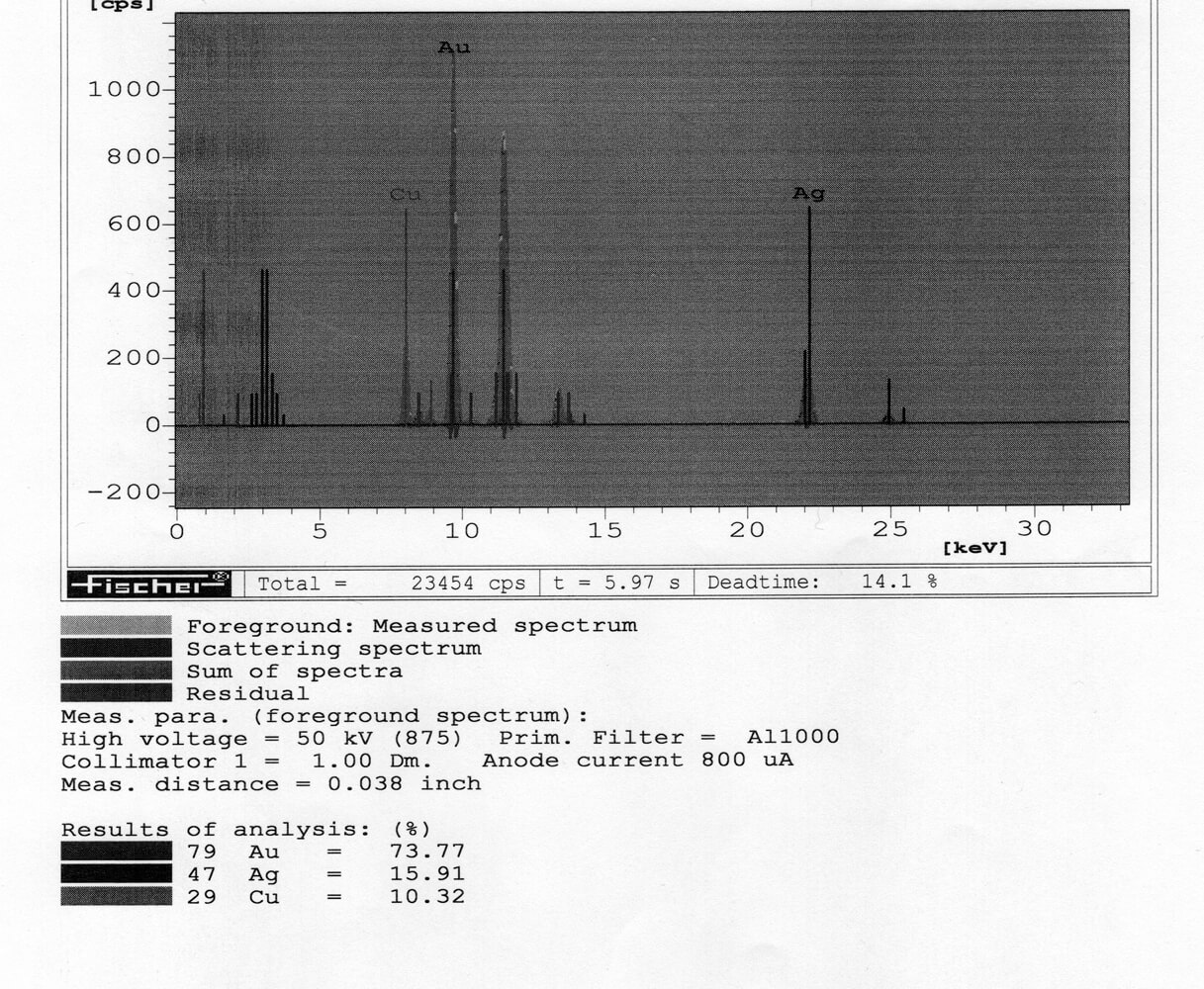 Metal analysis: 73.77 % gold, 15.91% silver, 10.32% copper.