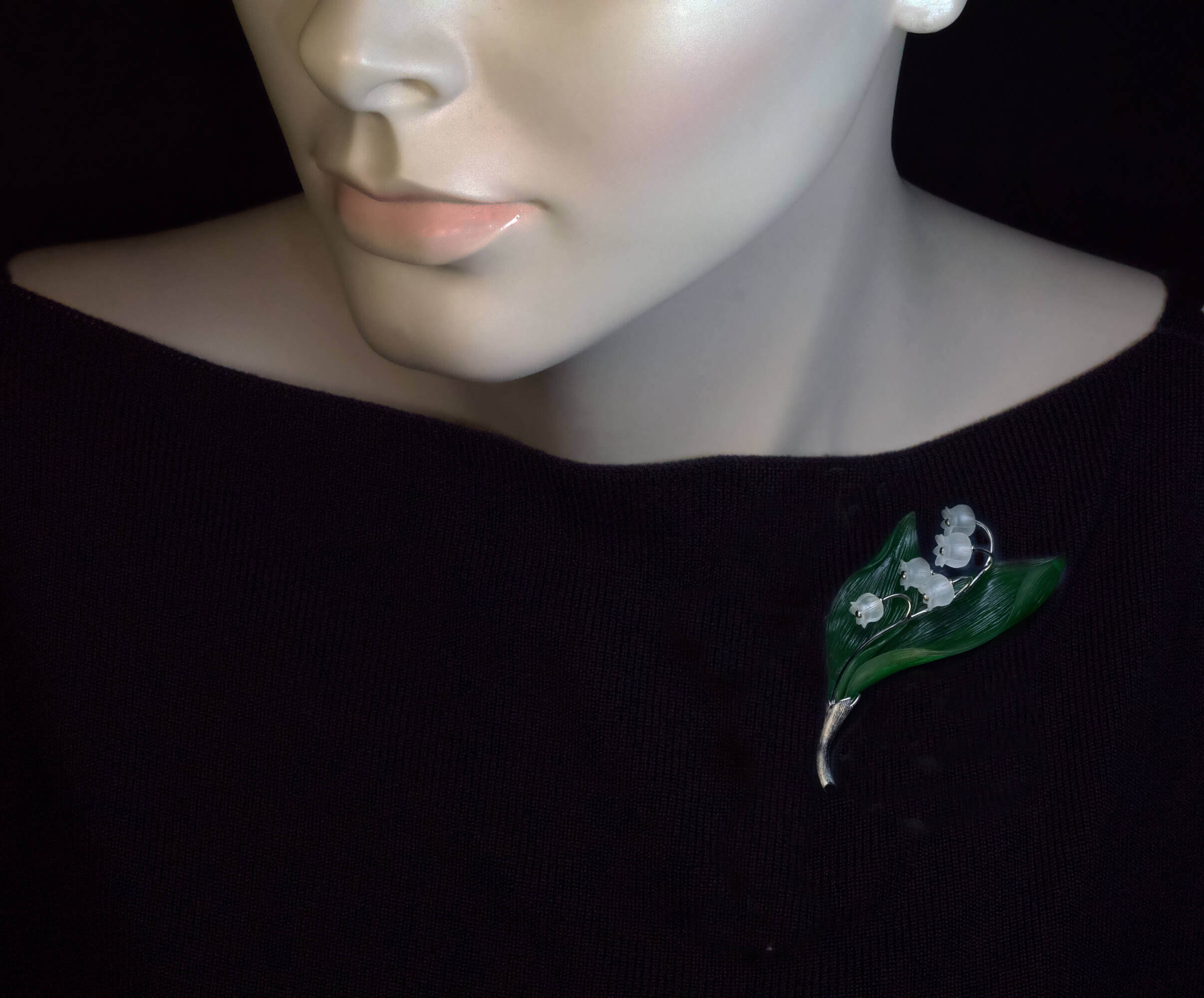 The brooch is finely modelled as a lily of the valley. The flower heads are carved from frosted rock crystal and mounted in 14K white gold. Each green leave is naturalistically carved from a single piece of nephrite jade.