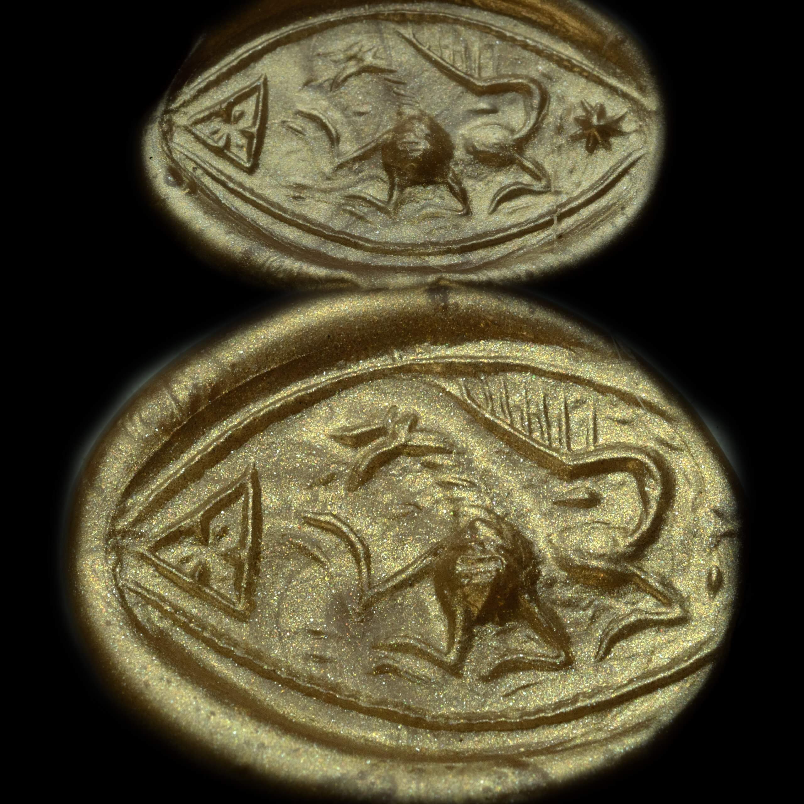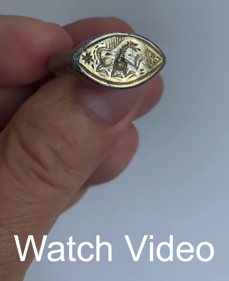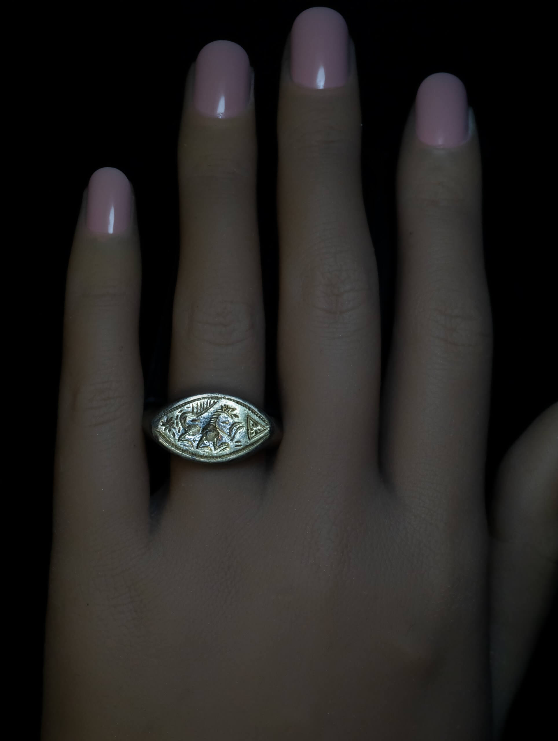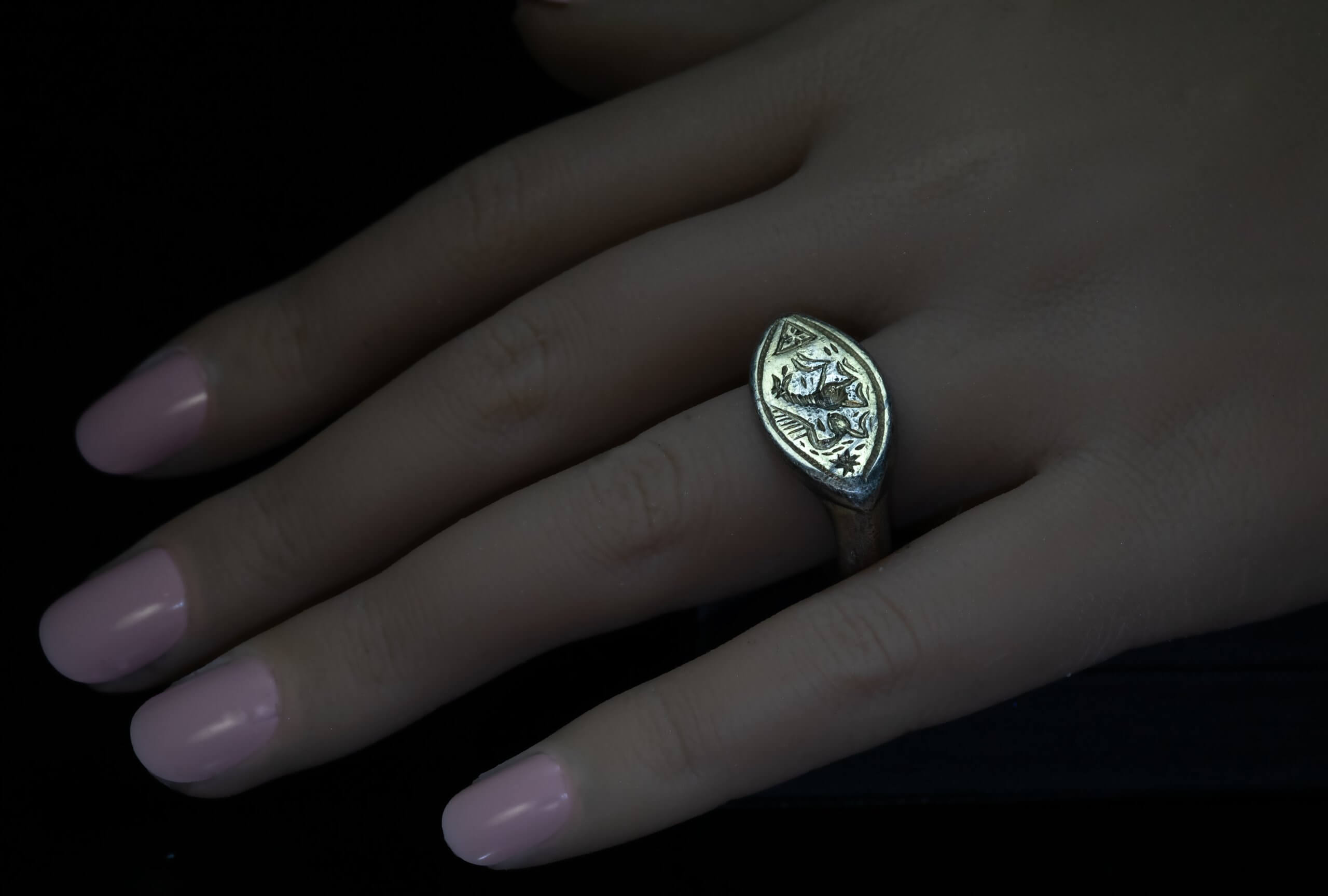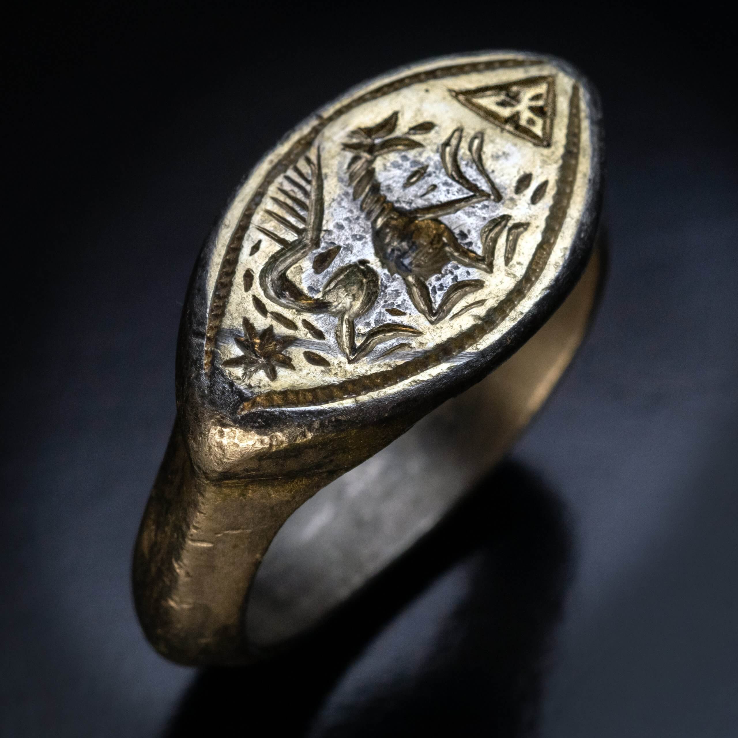 This almond-shaped medieval signet ring is finely modeled in high-grade silver (93.90%) and partially fire-gilded. The bezel is engraved with a mythical creature, possibly a dragon, flanked by a Gothic pointed trefoil and a star. The beast is depicted in three-quarter view, surrounded by engraved footprints that suggest movement and vitality.