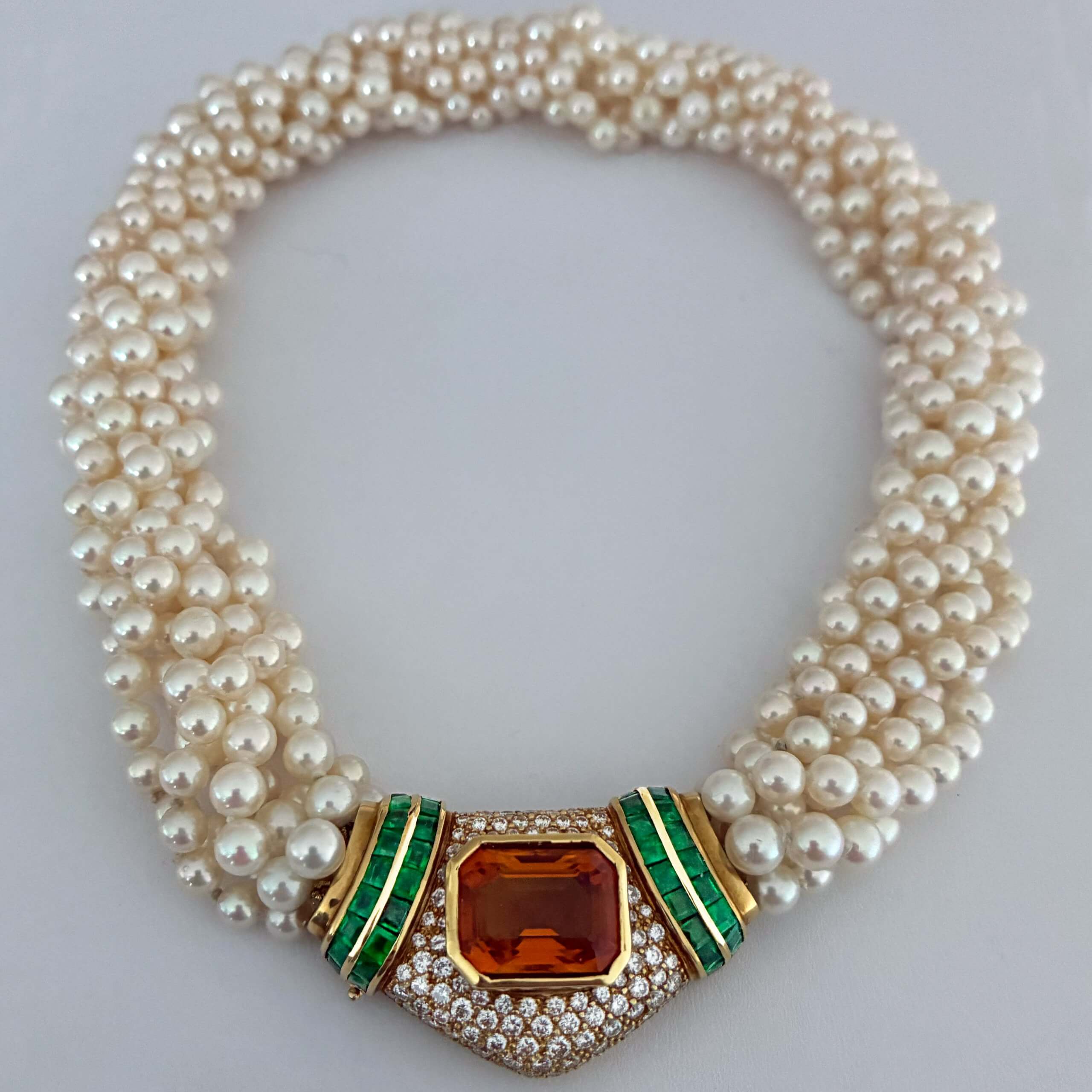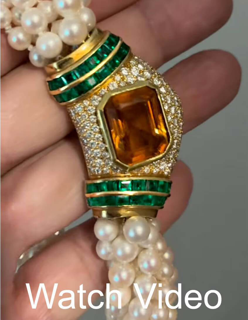 This vintage mid-20th century seven strand cultured pearl necklace is accented with a large jeweled 18K gold clasp. The clasp is centered with an emerald-cut citrine surrounded by diamonds and flanked by channel-set step-cut emeralds of excellent vivid green color.
