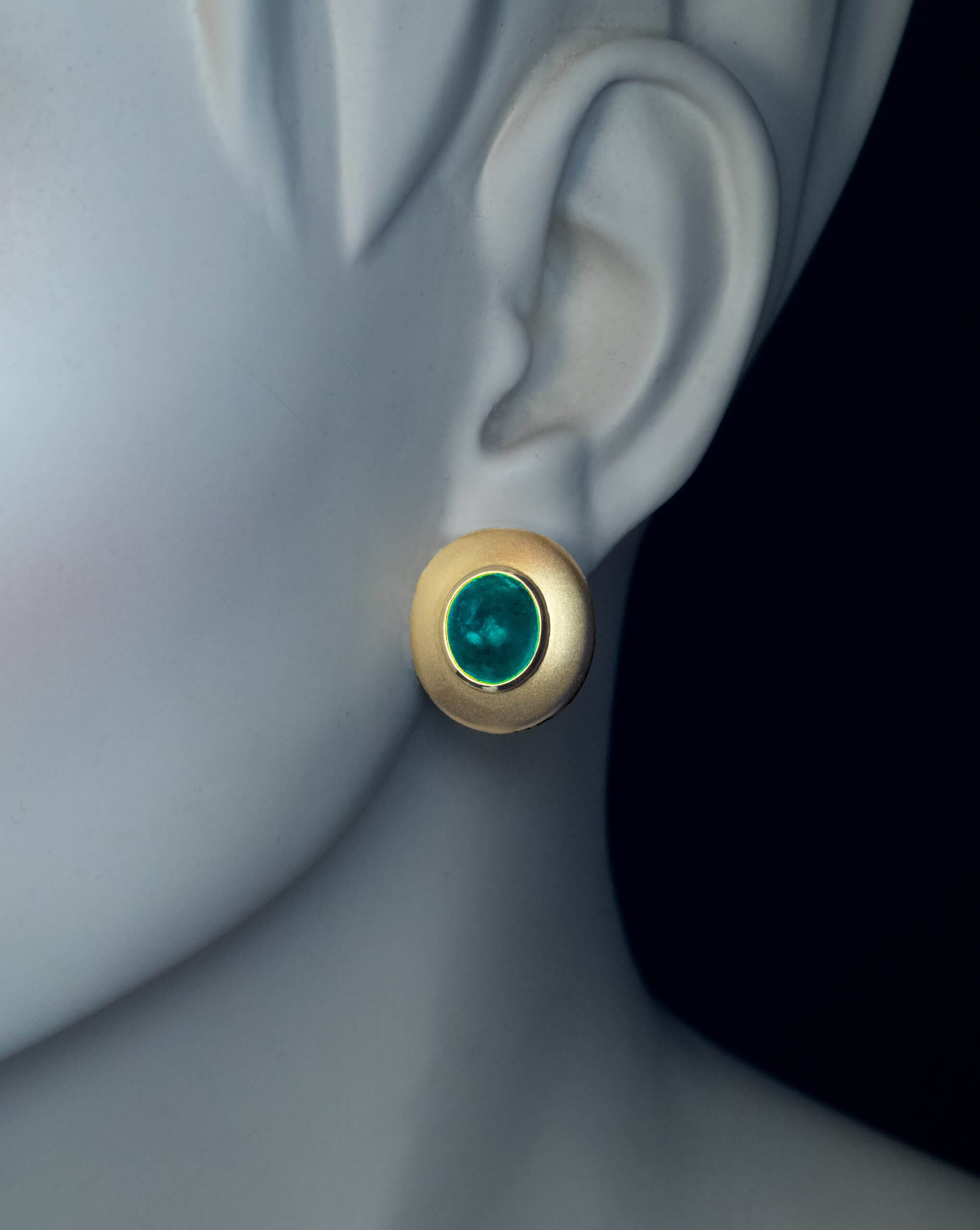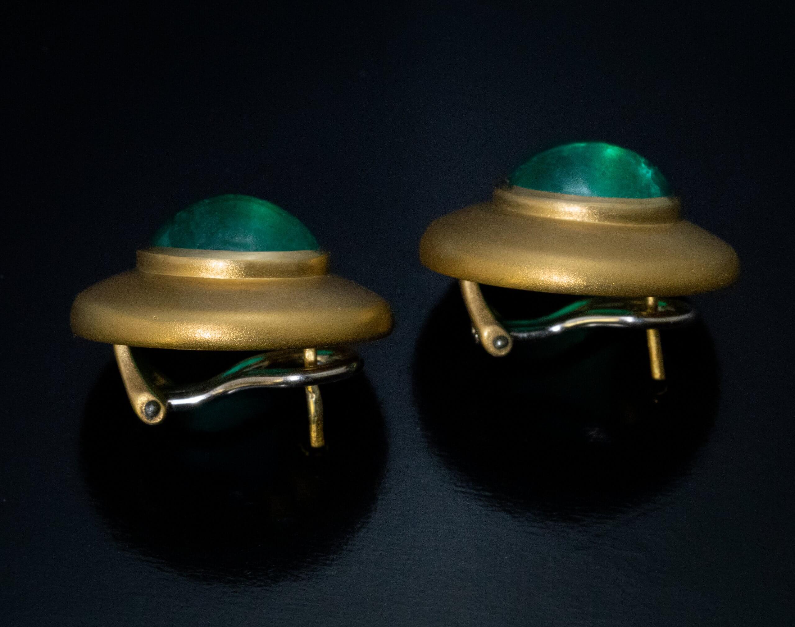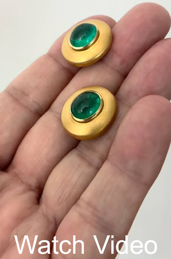 Each is finely executed in matte 21.6 karat yellow gold and centered with a bezel-set cabochon emerald, the stones well matched for color and proportions. The earrings are fitted with 18 karat white gold clip-backs.