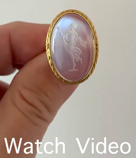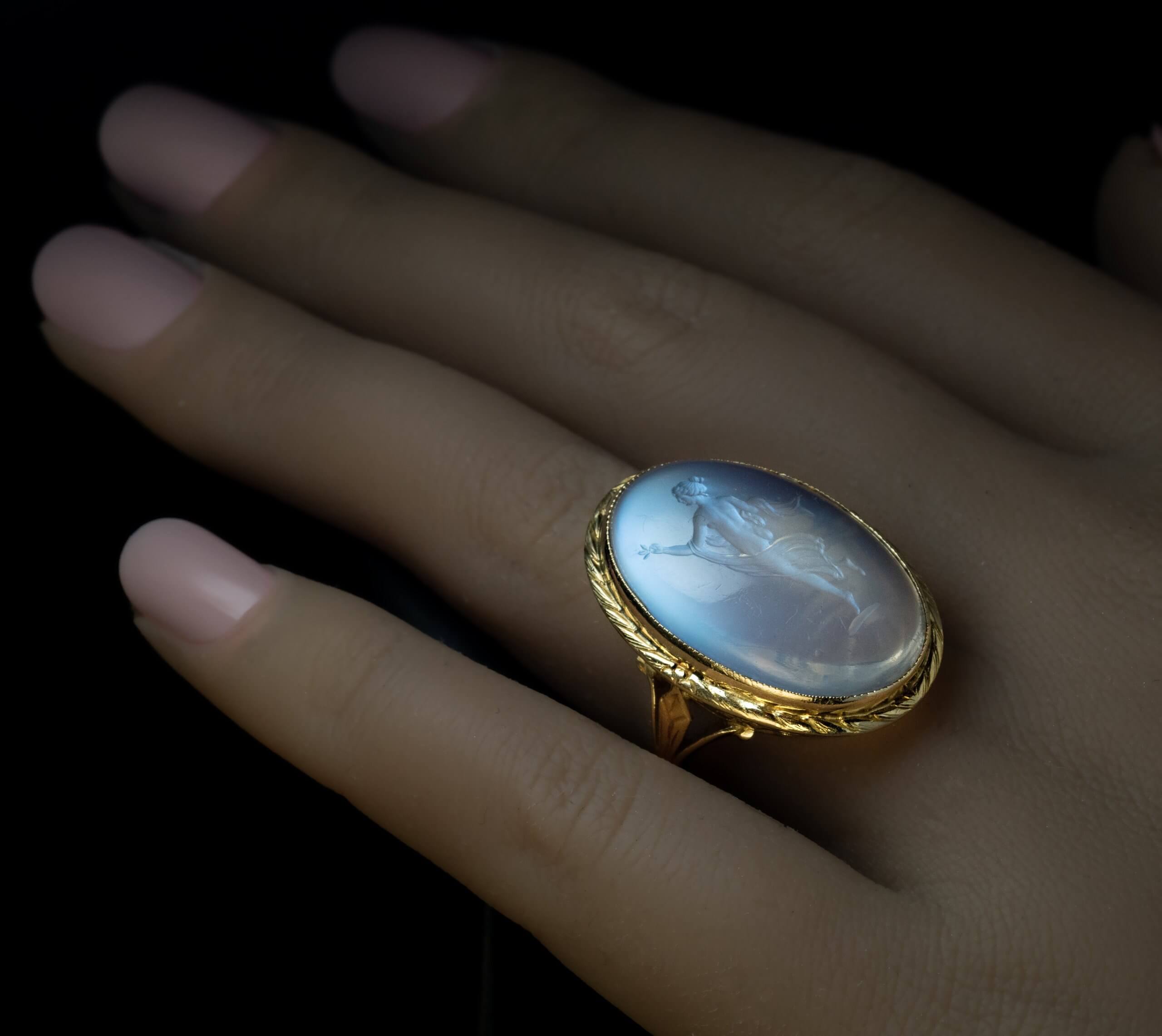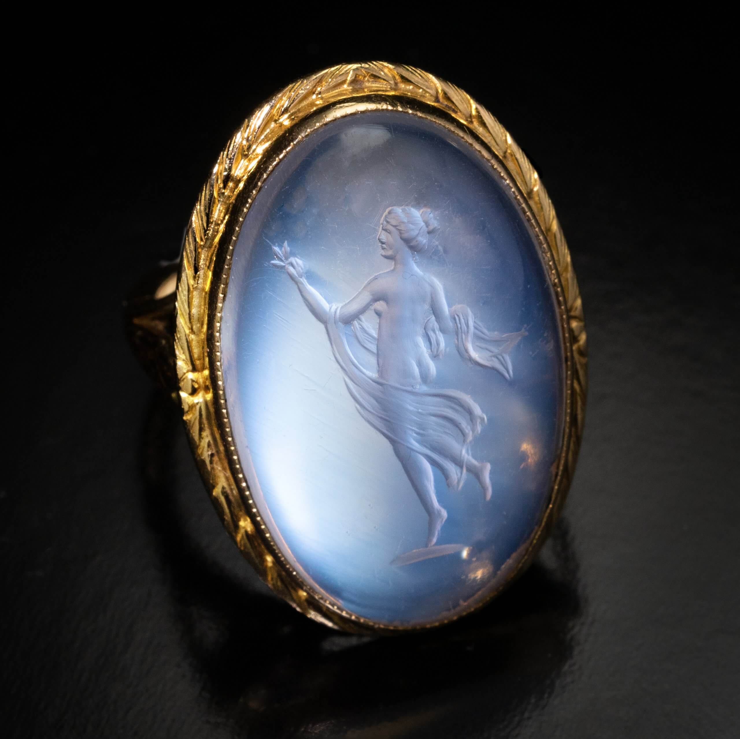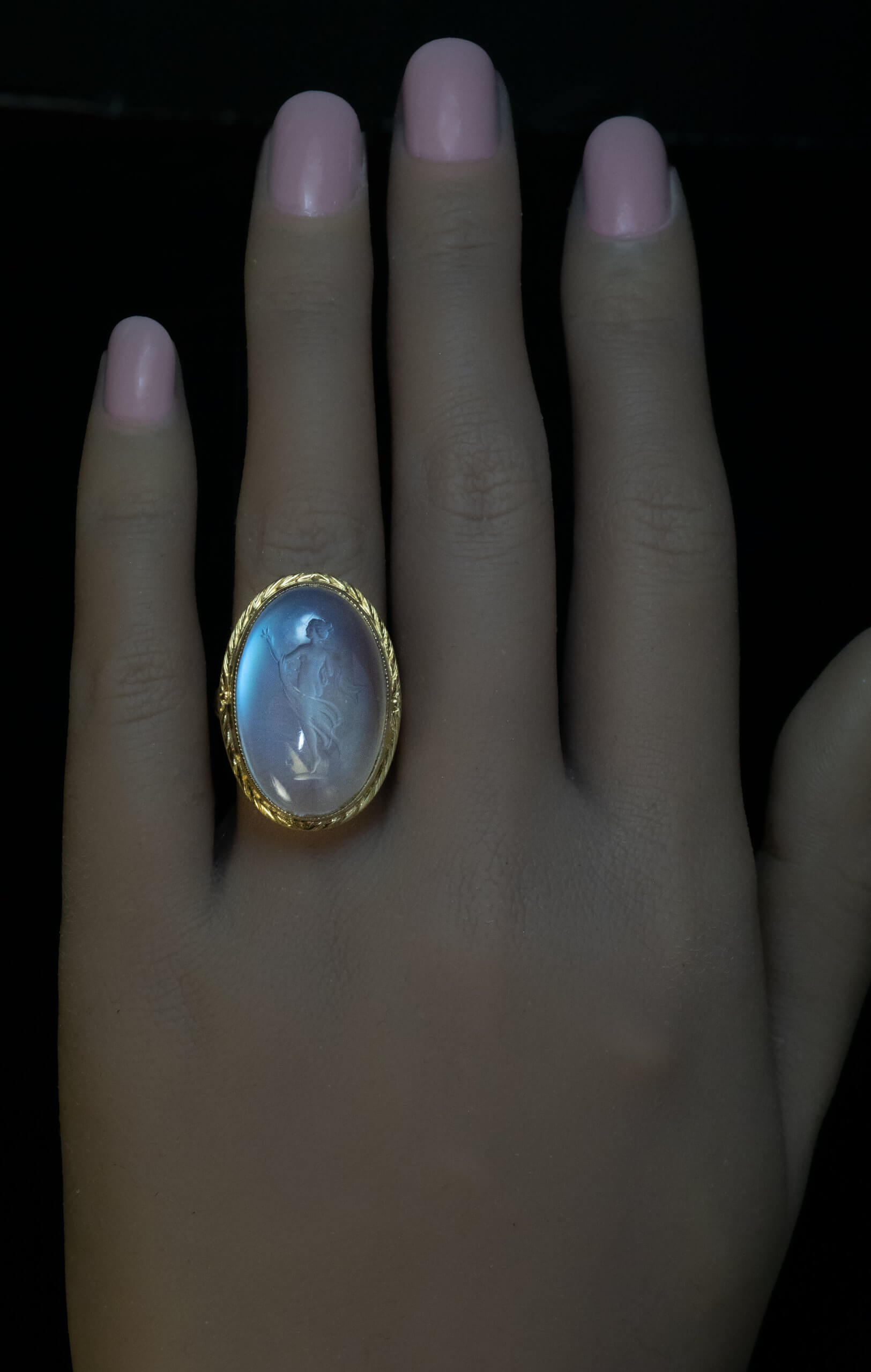 This antique Belle Époque ring is finely crafted in 18K gold and features a large bluish moonstone intaglio, finely carved in neoclassical taste with a semi-nude nymph. The intaglio is set in a gold bezel chased with laurel leaves.
