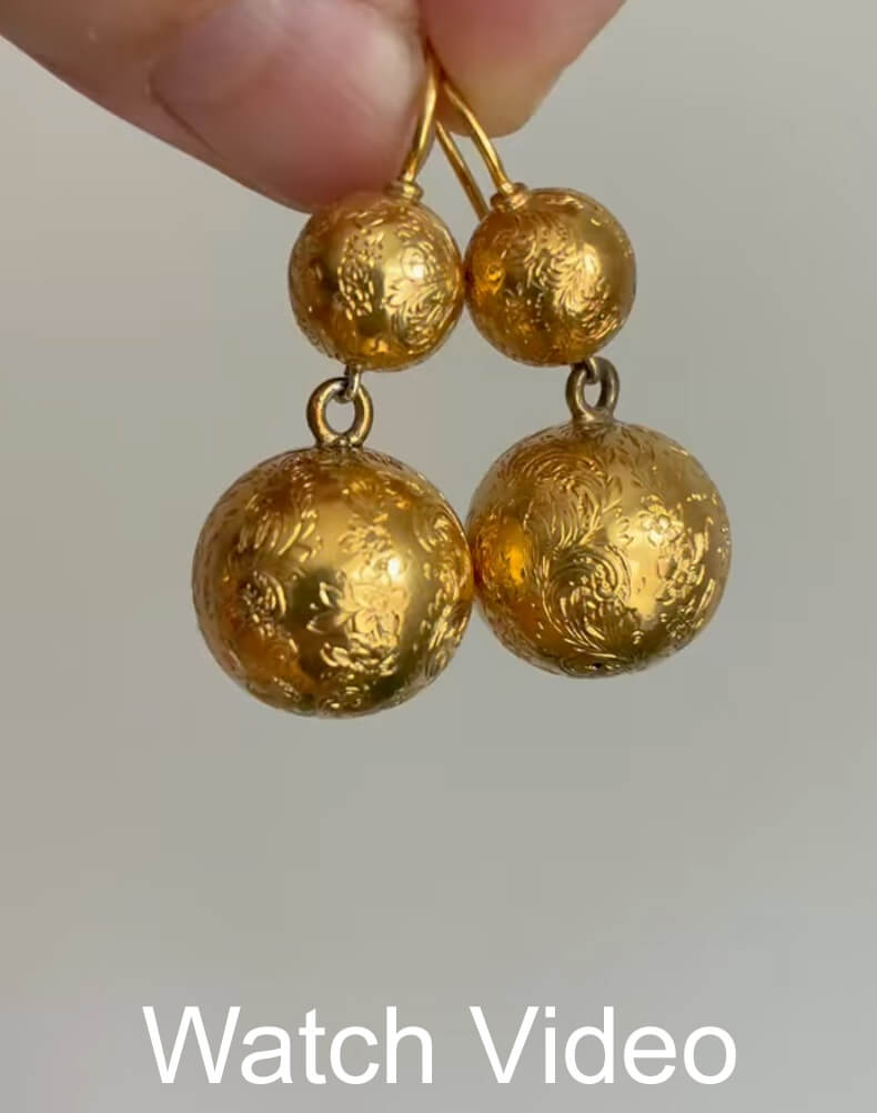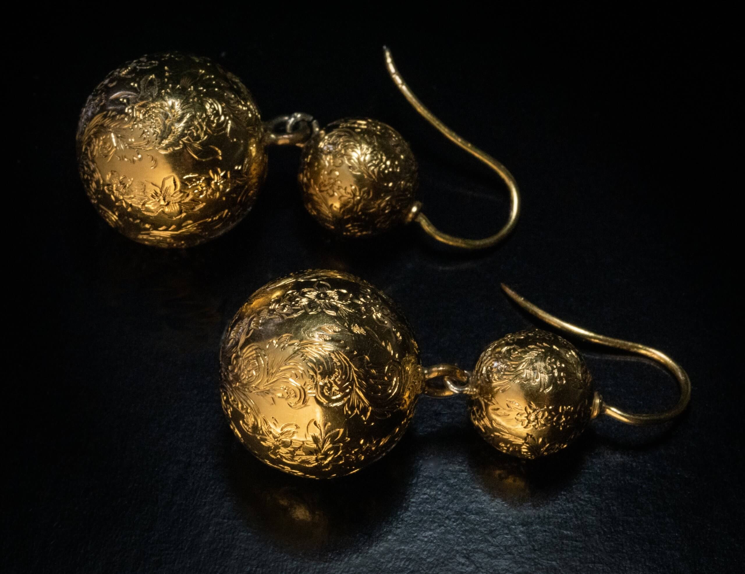 These antique high-karat gold ball earrings (approximately 21.17 kt) are entirely covered with finely hand-engraved floral motifs. The engraving reflects light from multiple angles, enhancing the brilliance and lively surface of the gold. The earrings are remarkably well preserved.